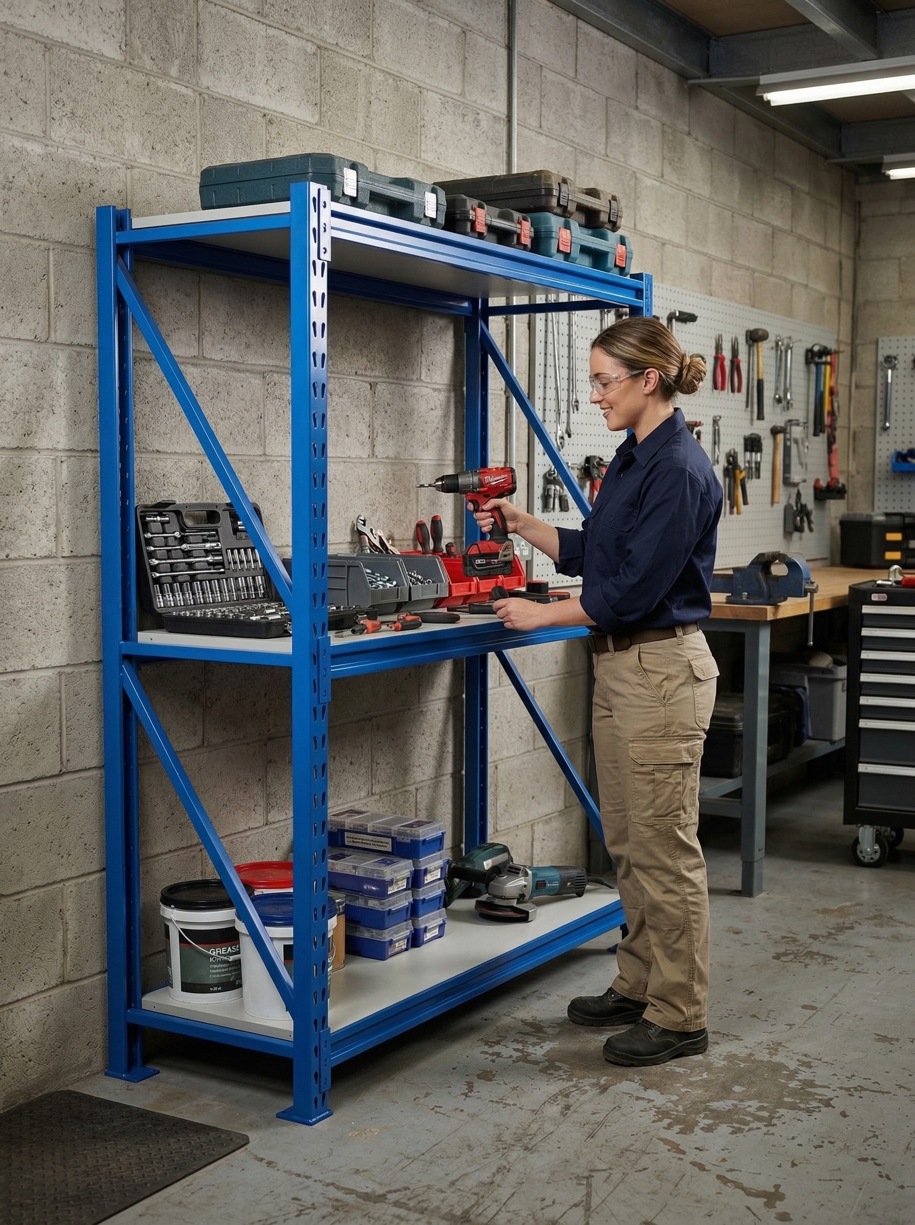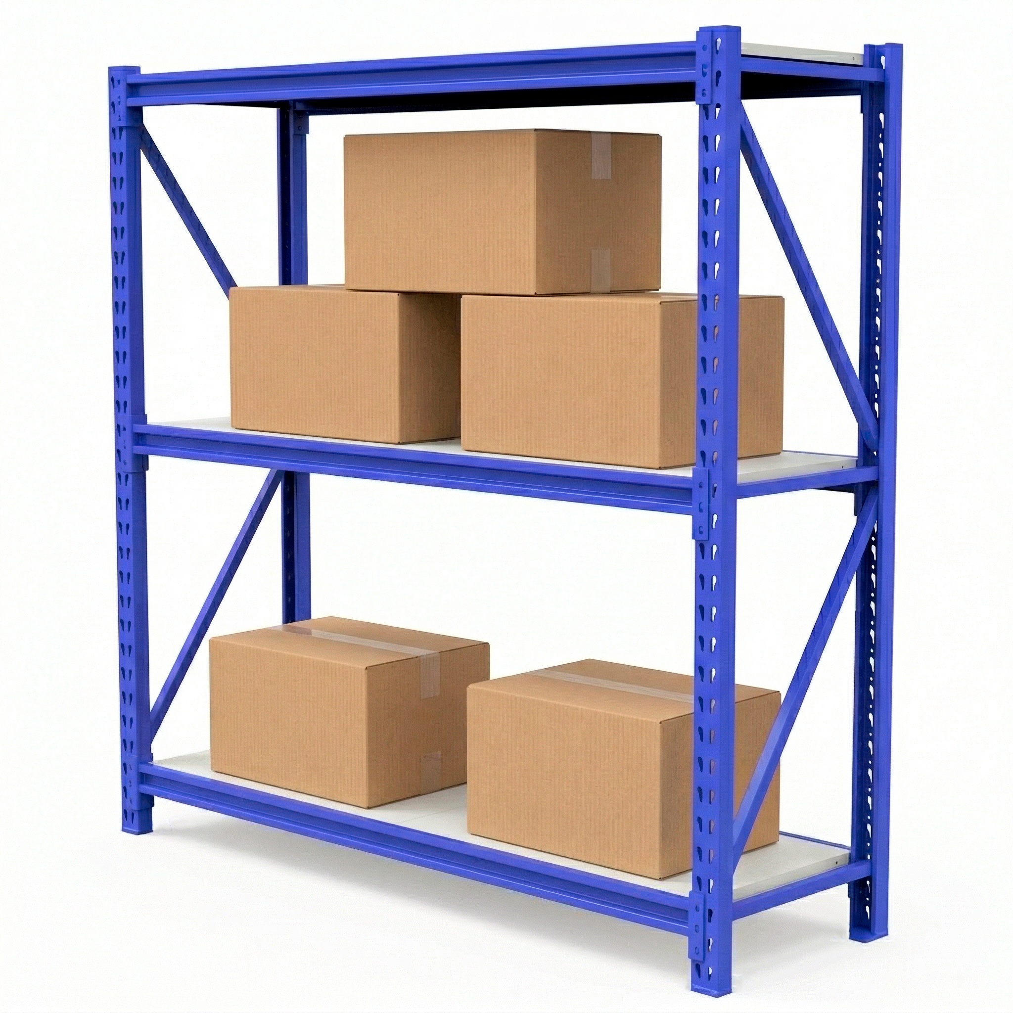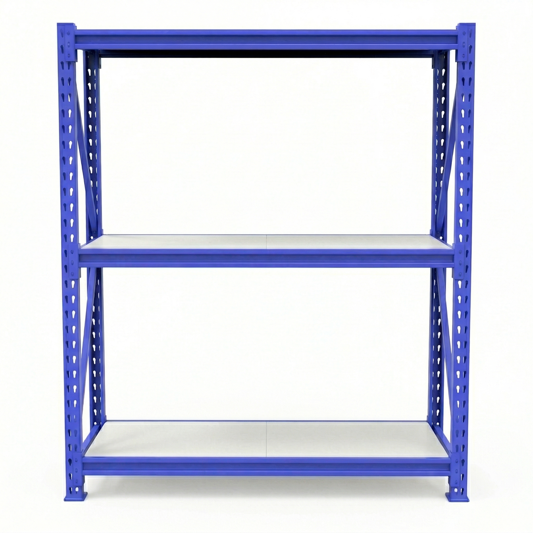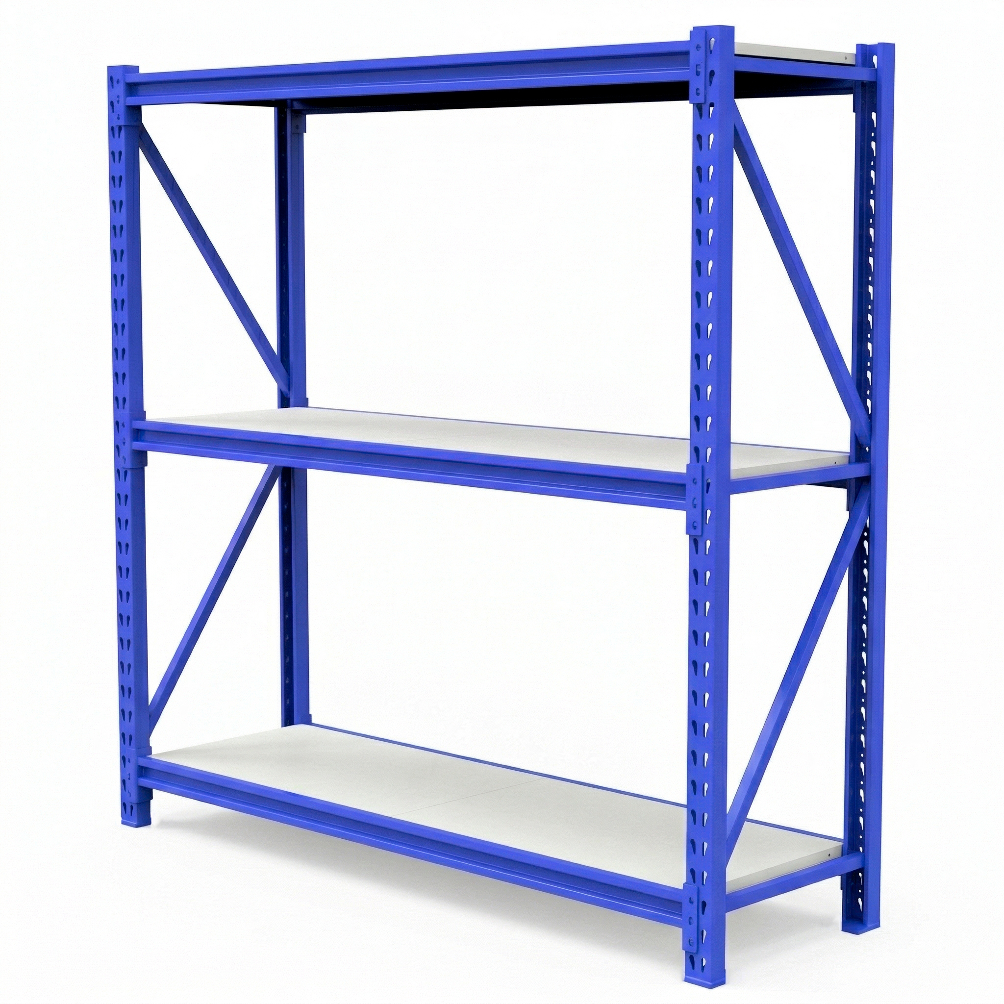 – Incluye 2 Pórticos color azul, de 60cm x 200cm de altura + 3 niveles de vigas metálicas de 200cm de largo, color azul + 6 estantes reforzados, de 100cm de largo cada uno, color blanco.