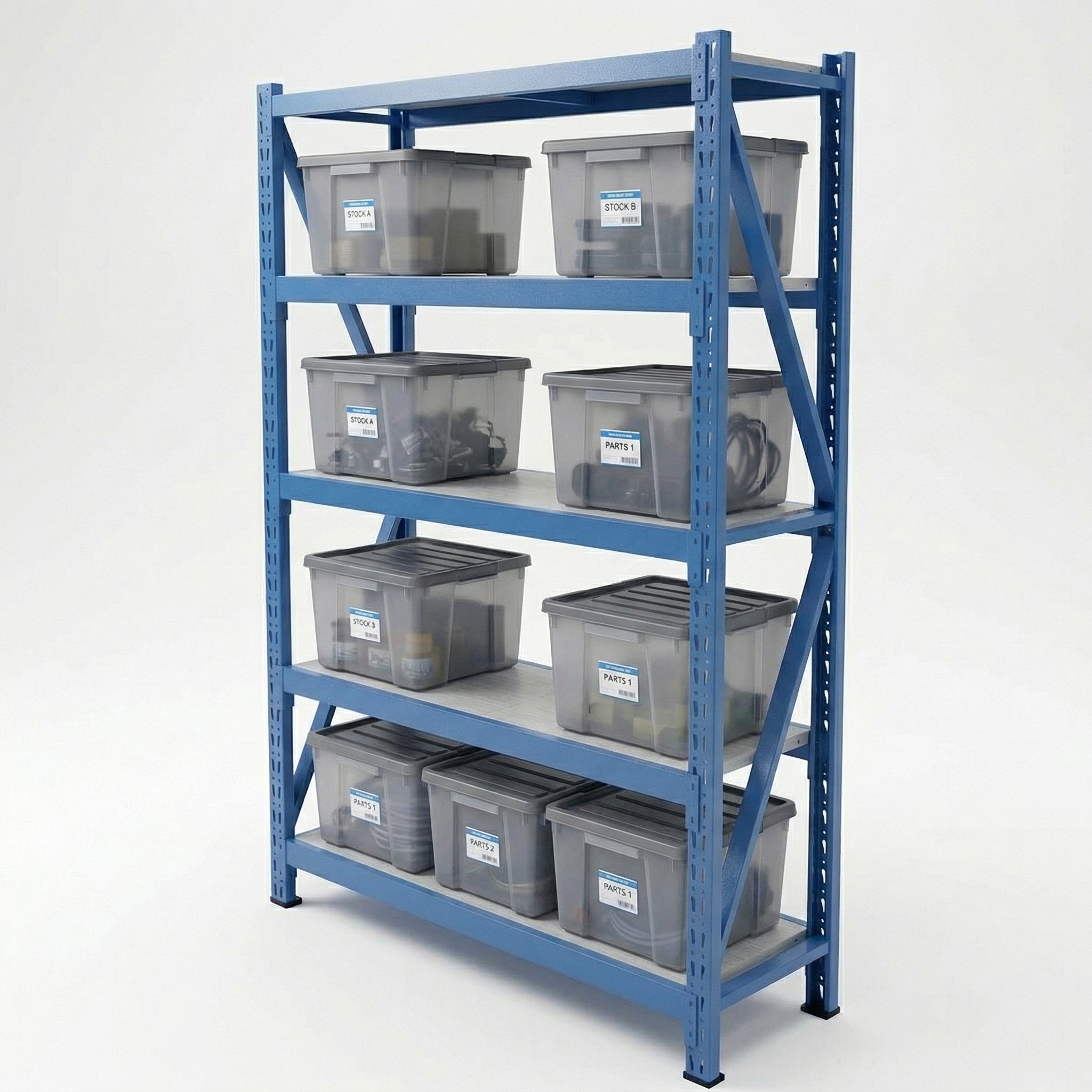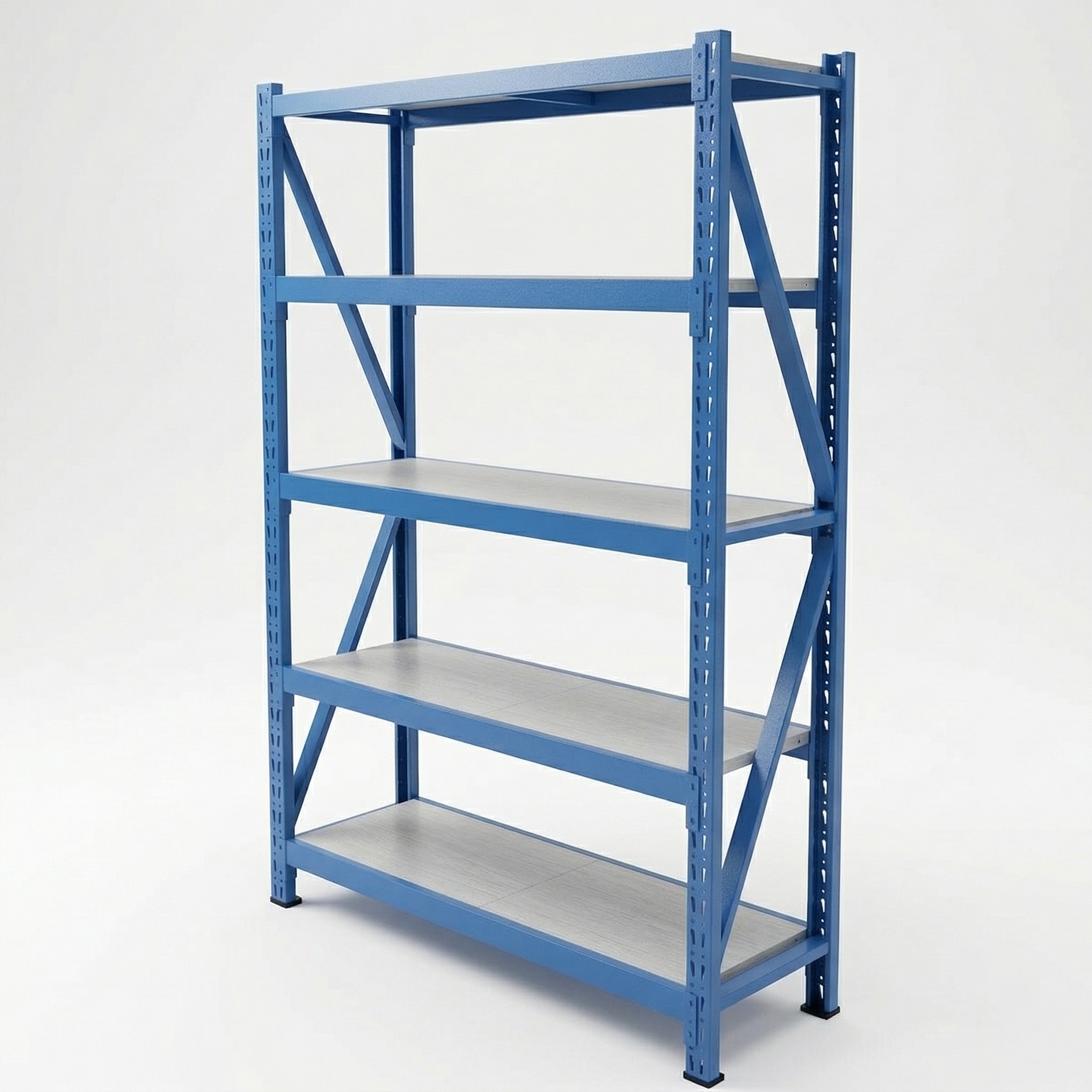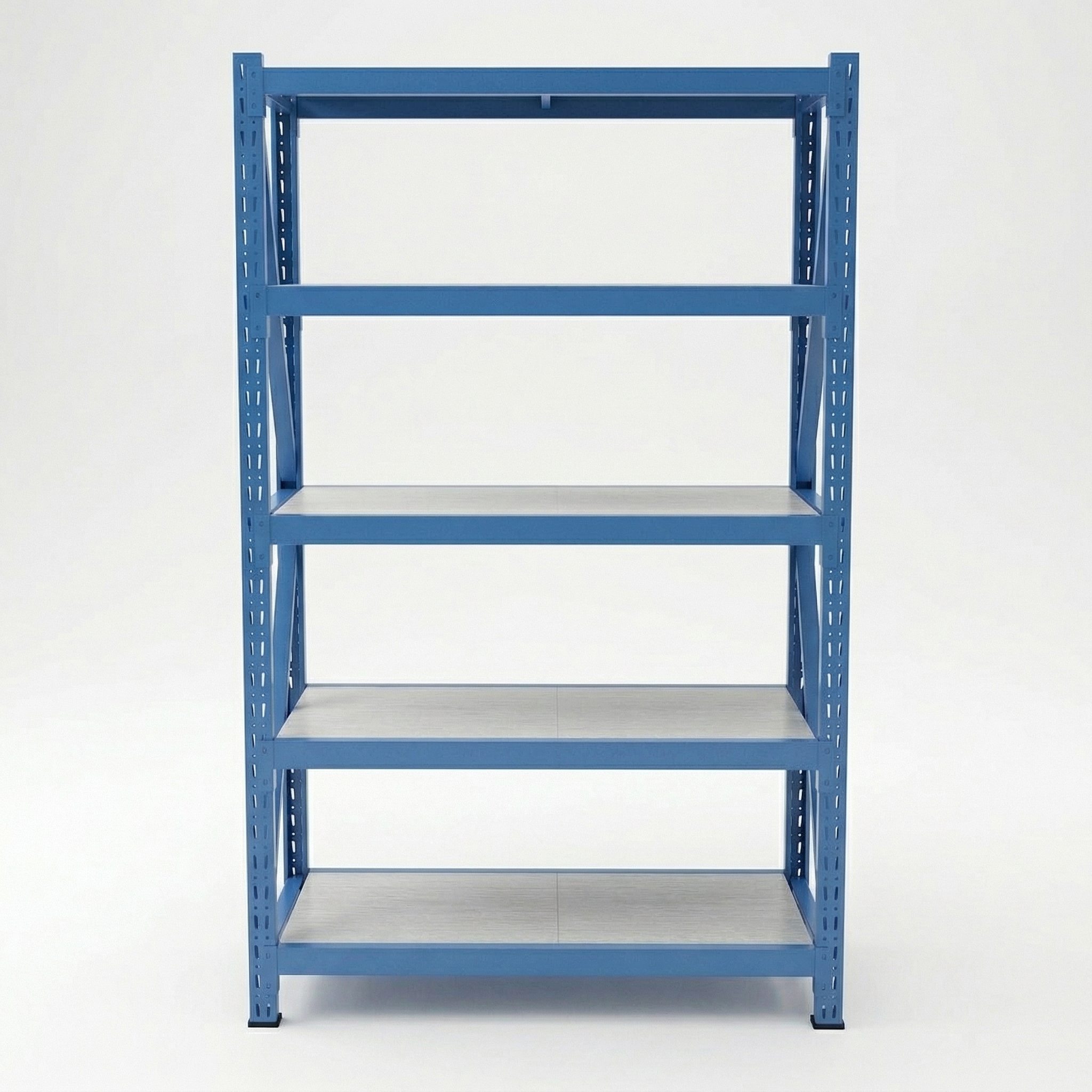 – Compuesto por 1 pórtico + 6 vigas de color azul y 5 estantes color blanco. Toda la estructura y bandejas en Acero y pintura electroestática.