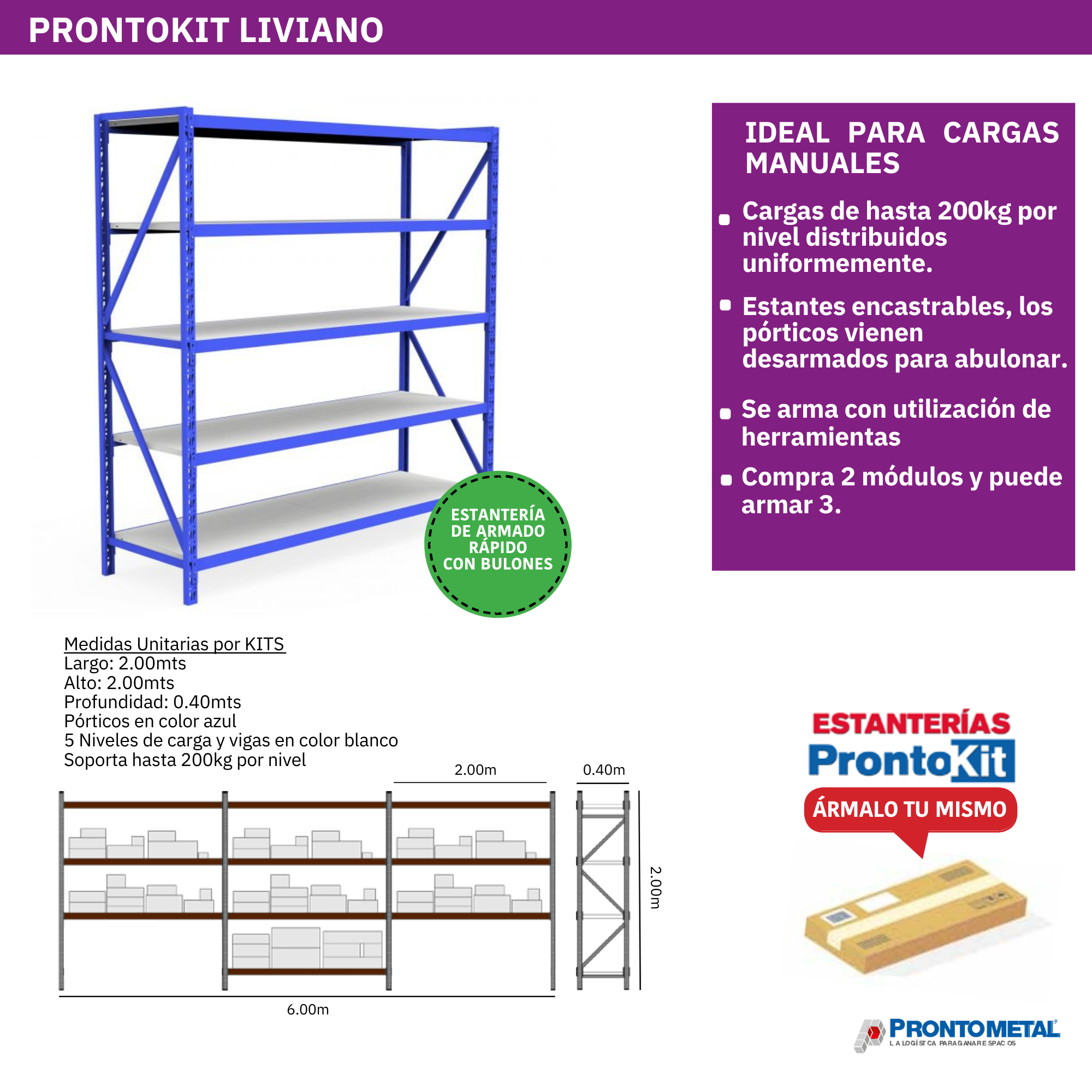 Prontokit modelo Prontorack liviano Módulo Inicial de 5 niveles 2 x 2 x 0.40 Mts 1000 Kgs
