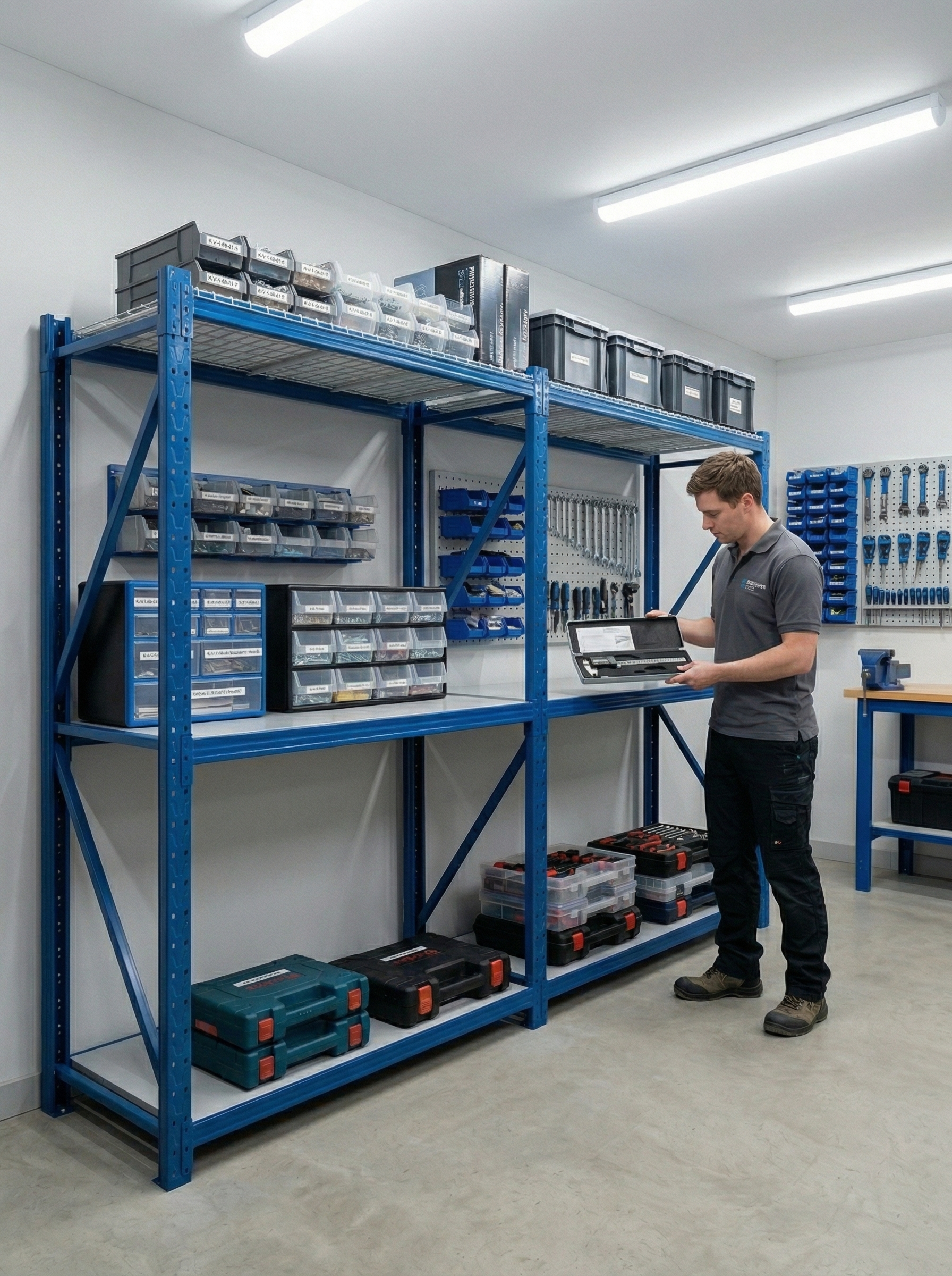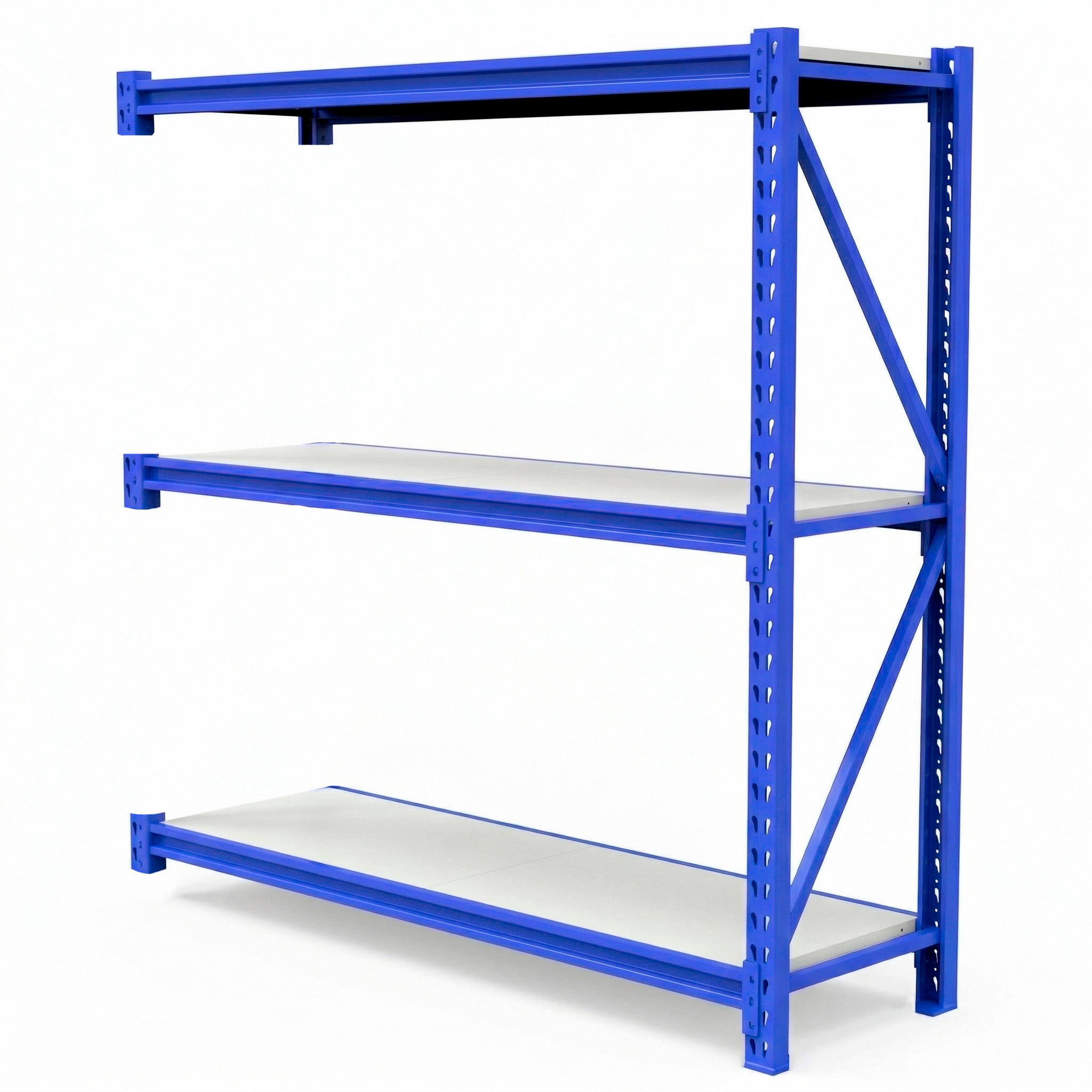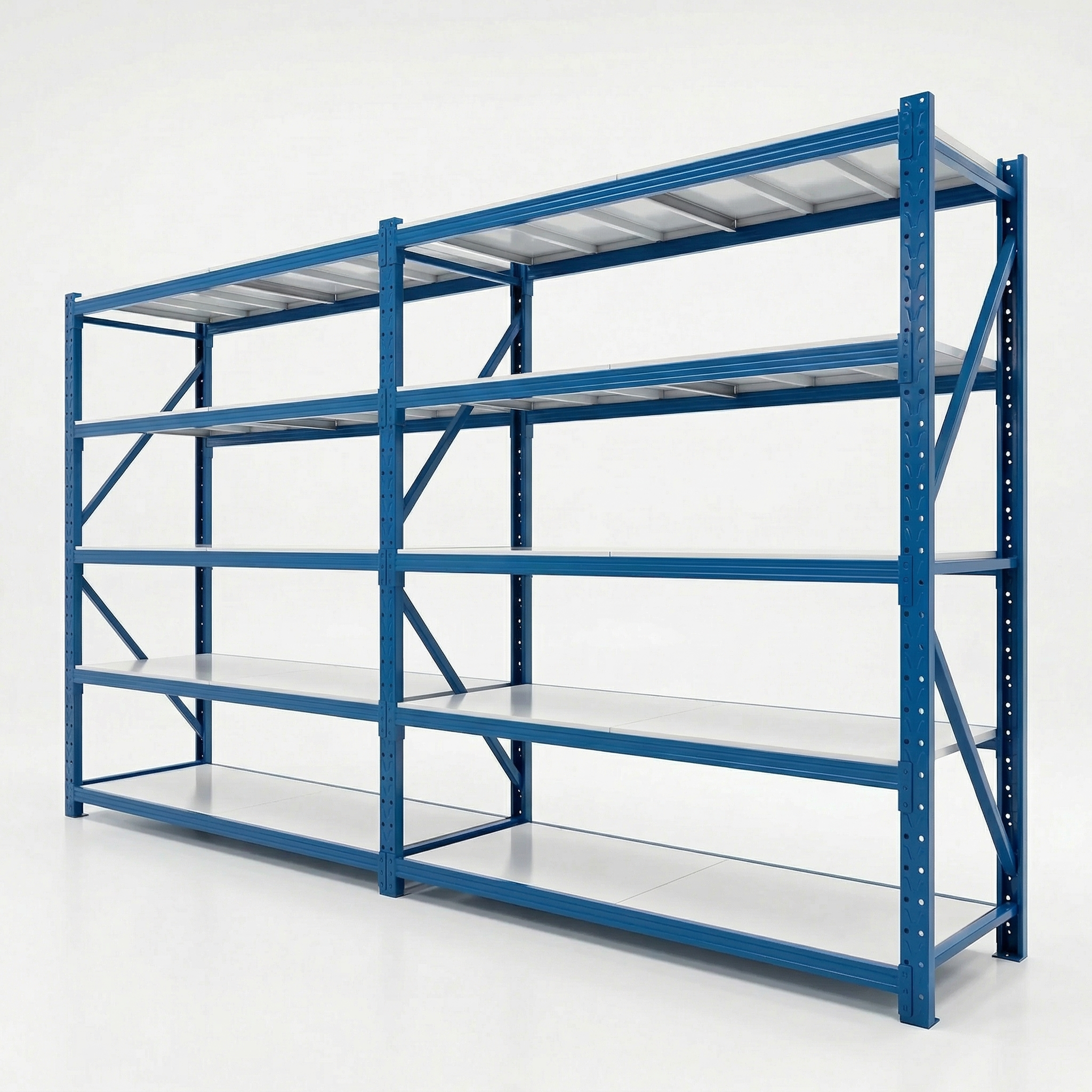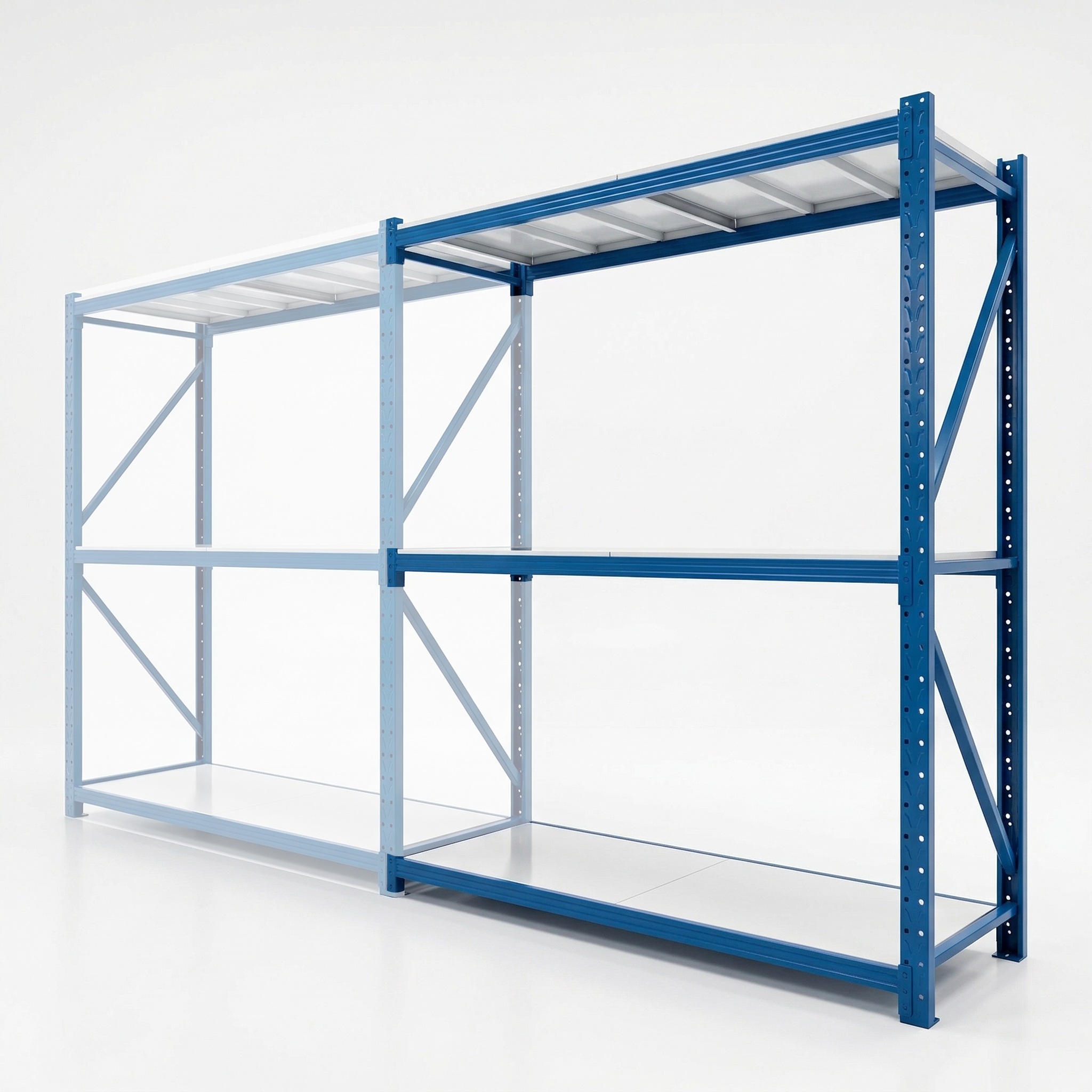 – Compuesto por 1 pórtico + 6 vigas de color azul y 6 estantes color blanco. Toda la estructura y bandejas en Acero y pintura electroestática.
