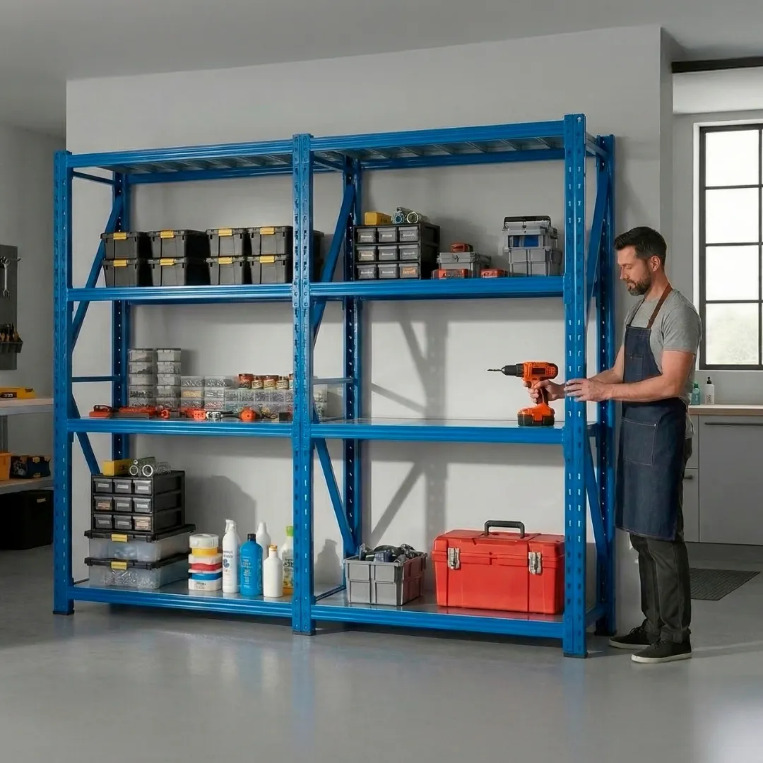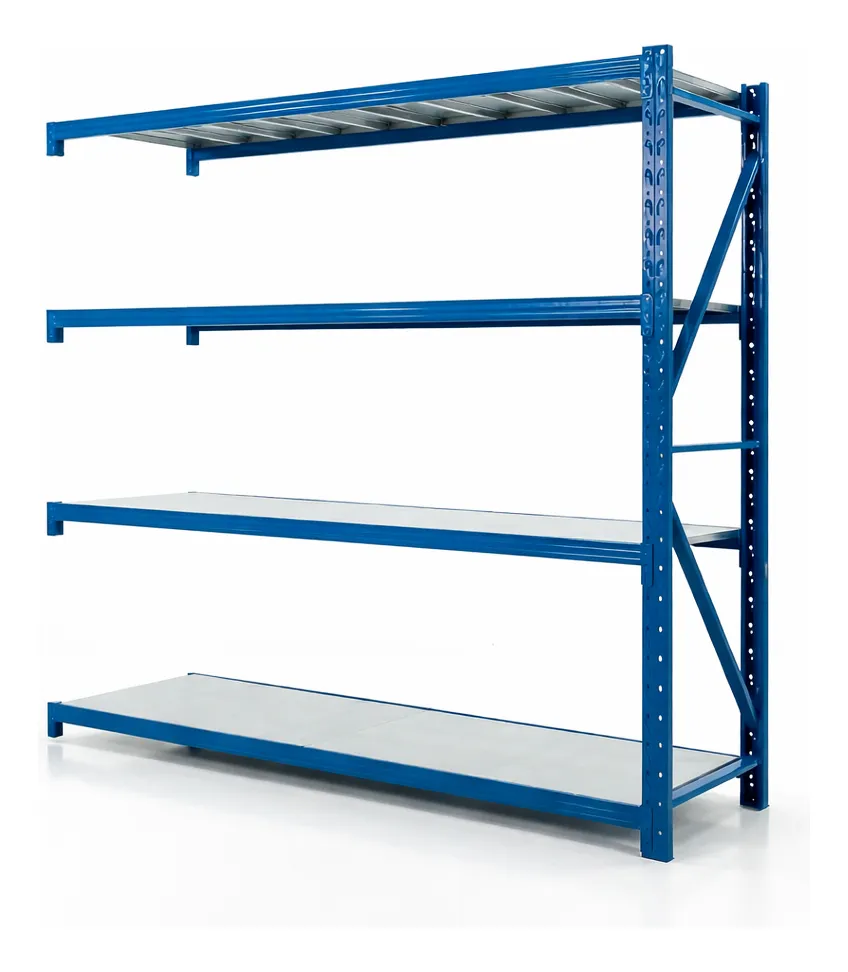 – Sistema de almacenaje metálico con estantes encastrables, los pórticos vienen desarmados para abulonar.