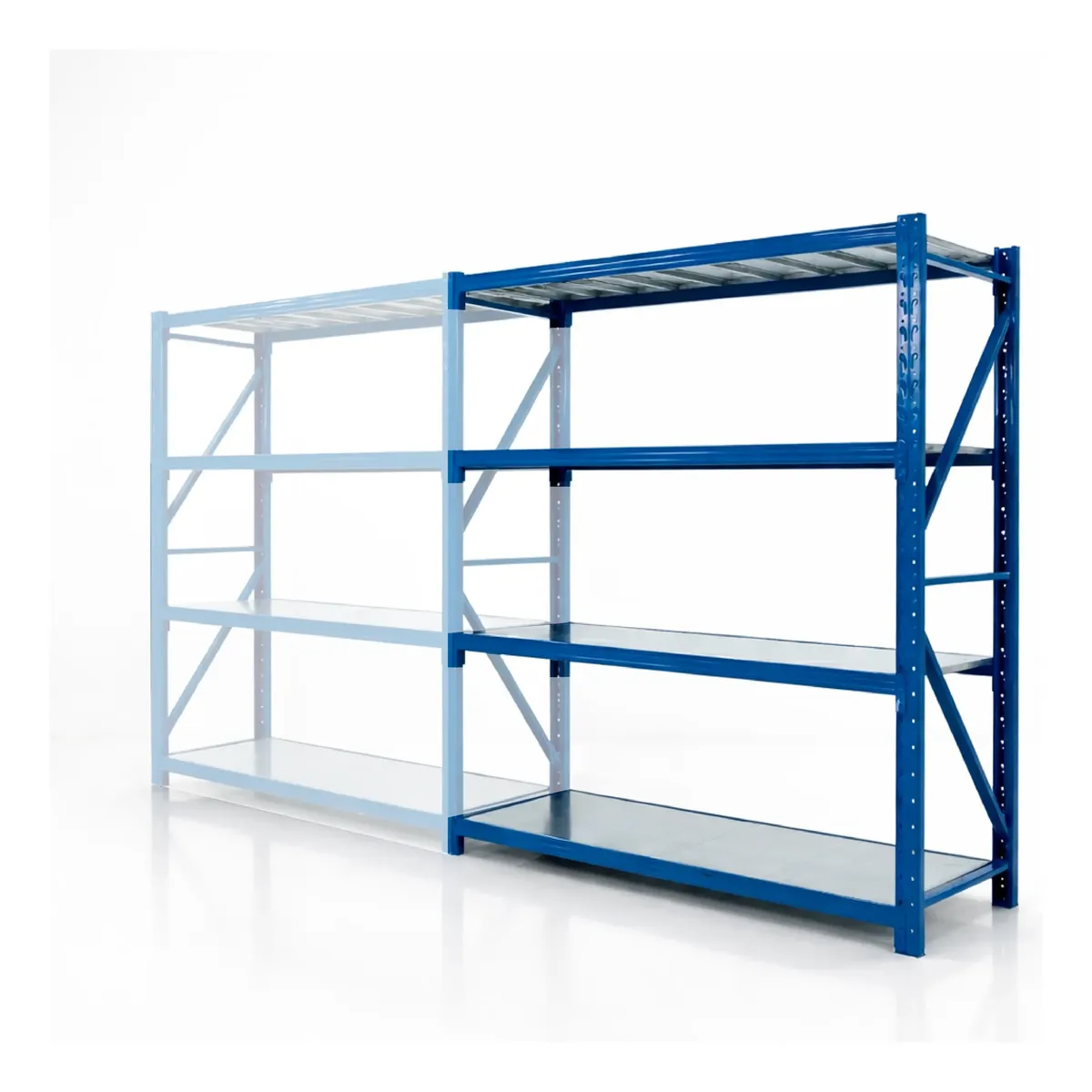 – Compuesto por 1 pórtico + 8 vigas de color azul y 8 estantes color blanco. Toda la estructura y bandejas en Acero y pintura electroestática.