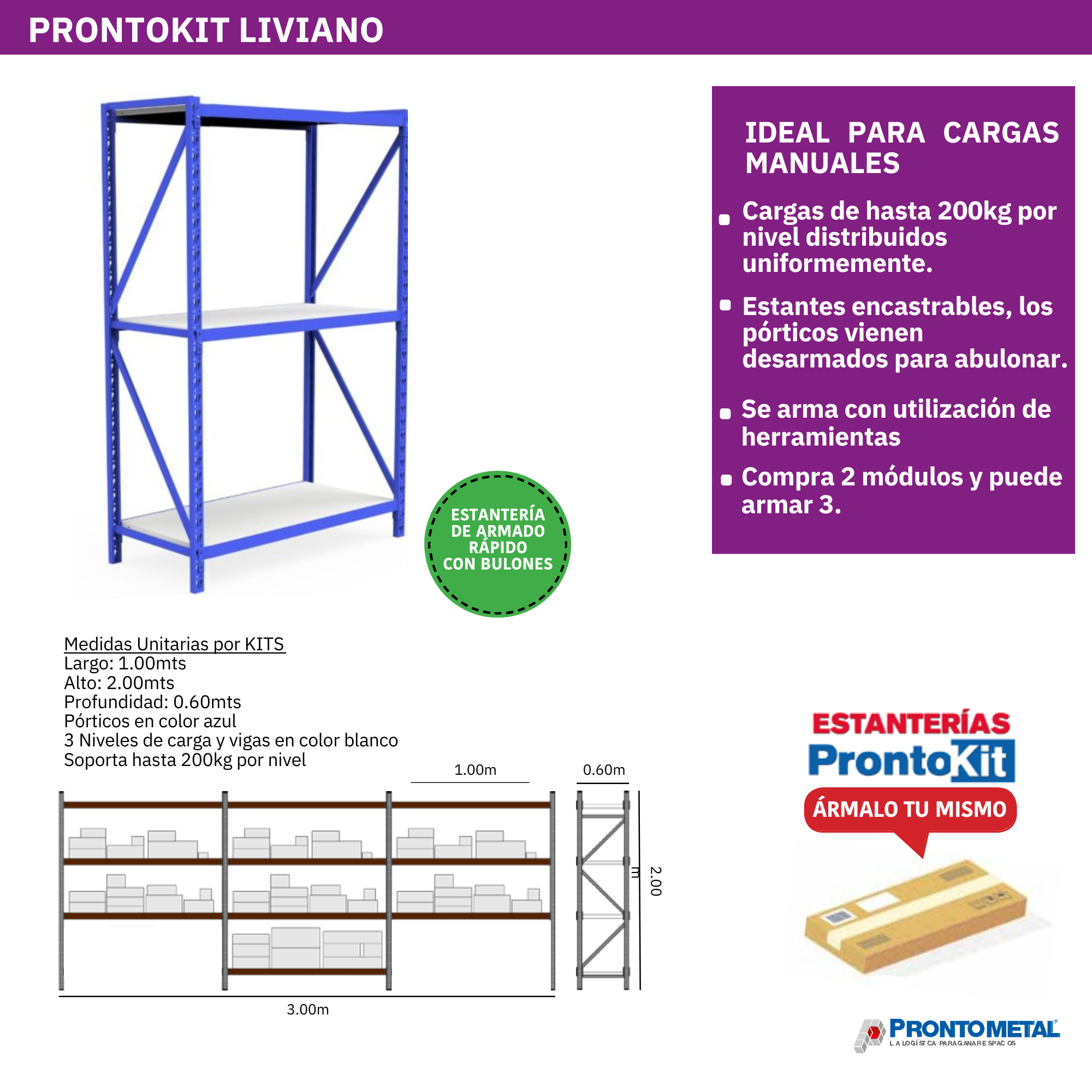Prontokit modelo Prontorack Liviano Módulo inicial de 3 niveles 2 x 1 x 0.60 Mts 600Kgs